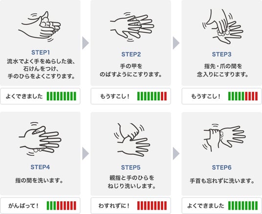 - 新製品は、手洗い6ステップ (図1) の正しさを95%以上の精度 (注2) で判定、平準化します。