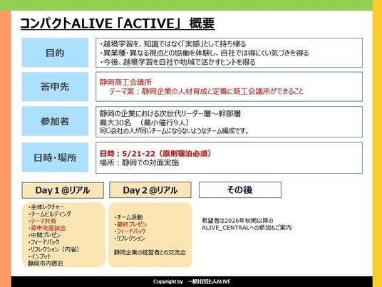 そんな中、「ALIVE経験者が社内にいない中で7日間の参加を決断することが難しい」「越境学習の意義を社内に浸透させづらい」といった声を受け、このたび1泊2日で参加可能な短期プログラム「ACTIVE」を初開催する運びとなりました。