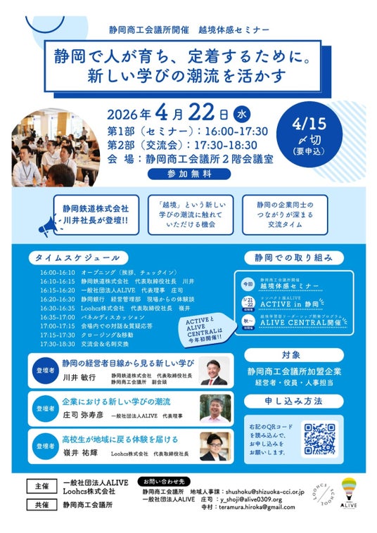 静岡商工会議所加盟企業を対象に、越境体験セミナー「静岡で人が育ち、定着するために。新しい学びの潮流を活かす」を、2026年4月22日に開催します。