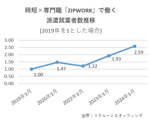 株式会社リクルートスタッフィング(本社:東京都千代田区、代表取締役社長:田中 智己、以下「リクルートスタッフィング」)は、時短勤務で専門スキルを活かす働き方「ZIPWORK」を選ぶ派遣スタッフが5年前と比較して約3倍に増加していることをお知らせいたします。今後もリクルートスタッフィングは、『「らしさ」の数だけ、働き方がある社会。』というビジョンを掲げ、働き方の選択肢を増やし、誰もが自分の時間を大切に「らしく」働くことのできる社会の実現を目指してまいります。