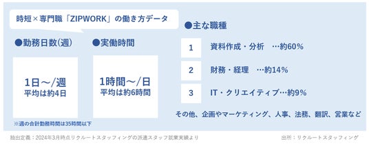 「ZIPWORK」とは:「ZIPWORK」とは、専門スキルを持つ人材が限られた時間内でその専門性を発揮する時短勤務の働き方。リクルートホールディングスが提唱し、リクルートスタッフィングが派遣サービスを通じて推進しています。この働き方は、育児や介護でフルタイム勤務が難しい方など様々な理由で時短勤務を希望する方々に選ばれ、多くの企業に受け入れられています。主な職種には、資料作成や分析などの事務、経理、IT、クリエイティブ、企画などがあります。