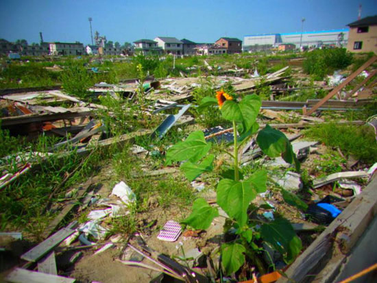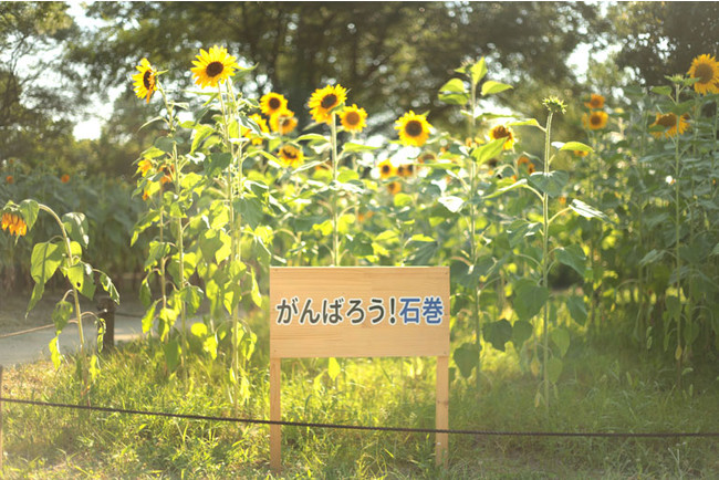 同年の夏、震災の津波により流れ着いた一粒のひまわりの種が、「がんばろう!石巻」の看板もとで芽を出し花を咲かせます。津波にも塩害にも負けずに咲き、たくましく生きるひまわりは「ど根性ひまわり」と呼ばれるようになります。