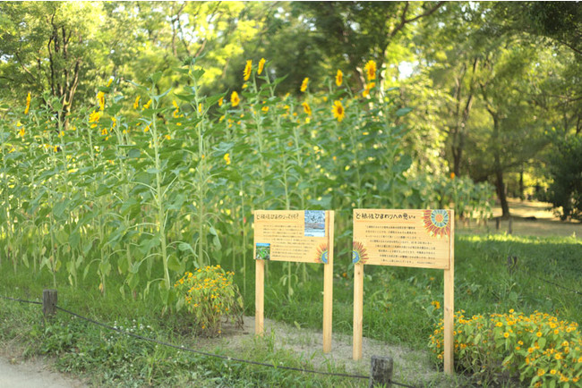大阪の万博記念公園にて開催されたヒマワリフェスタでは、震災メモリアルガーデンのど根性ひまわりの特設コーナーに、自分たちで手作りした看板も設置し、たくさんの方にど根性ひまわりを見て頂くことが出来ました。