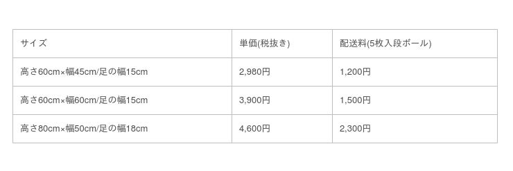 (例)高さ60cm×幅45cmの場合:1~5枚までは1カートンのため、送料1,200円。6~10枚までは2カートンになるため、送料2,400円。