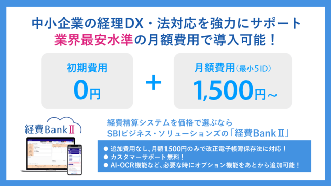 総合フィンテックソリューション企業であるSBI FinTech Solutions株式会社の子会社で、バックオフィス支援サービスを提供するSBIビジネス・ソリューションズ株式会社(本社:東京都港区、代表取締役社長:夏川 雅貴、以下「当社」)は、中小企業の経理DXと法対応を強力にサポートすることを目的として、従業員数50名以下の法人経営者が選ぶ「おすすめしたい経費精算システム」第1位*1であるクラウド型経費精算システム「経費BankII」を業界最安水準の月額1,500円(税抜)から導入できる、新料金プランの提供を開始することとなりましたので、お知らせいたします。