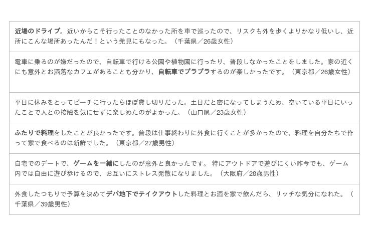 デートの行き先や過ごし方に変化が見られた中で、新たな楽しみを見つけたという声も聞かれました。その中から、いくつか「意外と楽しかった」と感じた過ごし方を紹介します。