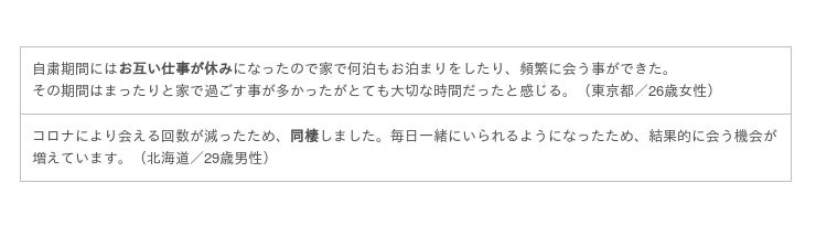 恋人同士、コロナ禍の中でお互いの存在の大きさに気付いた人が多いようです。家にいる状況で、「将来のふたりの生活が想像できた」という声もありました。非常時に支えになる存在だと改めて感じることで、心の距離は今までよりも近くなる傾向が見られました。