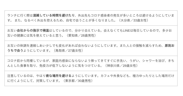 また「お互いの健康状態を確認」したり、「検温してから会っている」「マスクを外さない」など、お互いを思いやることで、支え合う恋人たちも見受けられました。恋人同士であるがゆえ、「手など接触を減らす」のは3.5%となかなか難しいようです。