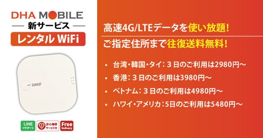 株式会社DHA Corporation (本社:東京都港区、代表取締役:鄧嘉堂・菊地華絵) は、海外用レンタルWiFiのお取り扱いを、公式オンラインストア(https://www.dhasim.jp/eshop )にて開始いたしました。DHA Mobileとして国内外のSIMを販売してきた通信領域の強みを活かし、新たにレンタルWiFiを展開することで、「SIMを入れ替えるのに抵抗がある」「大人数で使いたい」「スマホ、パソコンなど色々な端末で繋ぎたい」という様々なニーズにお応えします。