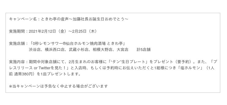 この度、当社のパートナーであり、仙台で本家「ときわ亭」を展開する株式会社常盤食品(本社:宮城県青葉区、代表取締役社長 加藤栄一)の加藤社長の誕生日(2月19日)を記念してキャンペーンを期間限定で開催します。2月生まれのお客様を対象に、牛タンを豪華に盛り付けた「“タン”生日プレート」をプレゼント。また、期間中ご来店いただいたお客様には名物「塩ホルモン」をプレゼントします。