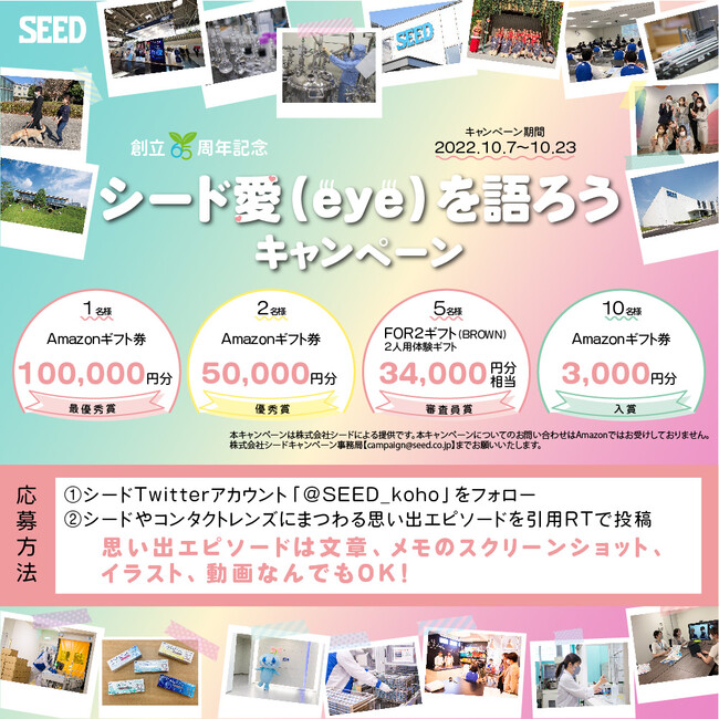 株式会社シード広報公式Twitterアカウント「@SEED_koho」をフォローいただき、該当ツイートに当社やコンタクトレンズにまつわる思い出エピソードを引用リツイートで投稿してください。文字数や投稿方法、投稿内容(テキスト、写真、イラスト、動画等)は問いません。最優秀賞「Amazonギフト券(Eメールタイプ)100,000円分」を1名様、優秀賞「Amazonギフト券(Eメールタイプ)50,000円分」を2名様、審査員賞「FOR2ギフト(BROWN)34,000円分相当」を5名様、入賞「Amazonギフト券(Eメールタイプ)3,000円分」を10名様にプレゼントいたします。また、受賞作品は当公式Twitterアカウントで発表いたします。