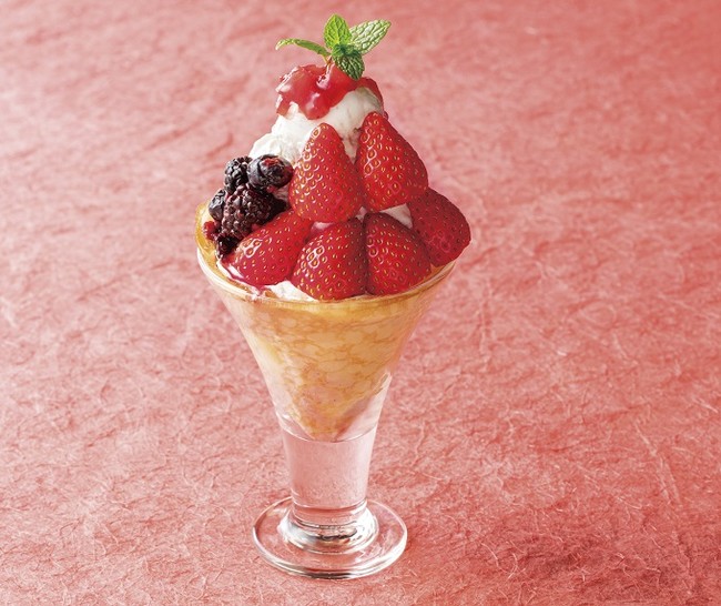 上部にたっぷりとフレッシュないちご、いちごショートケーキアイスやミックスベリーソースなど、いちご本来の美味しさを引き立たせる仲間を配し、クレープの奥には濃厚な甘みとフレッシュいちごのコラボレーションを楽しんでいただきたく、バニラアイスクリームやバナナを内包し、多彩で甘美なパフェの世界をご堪能いただけます。
