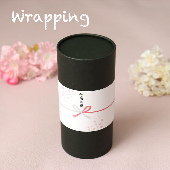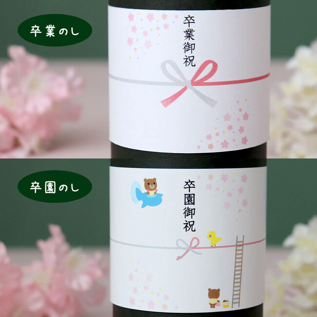 卒業証書が入っているかのような黒の丸筒に、「卒業御祝」または「卒園御祝」の熨斗を巻いてお届けいたします。家族や先生からの温かいおめでとうの気持ちが伝わります。