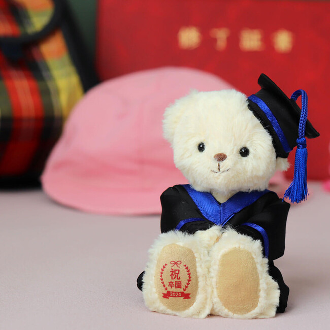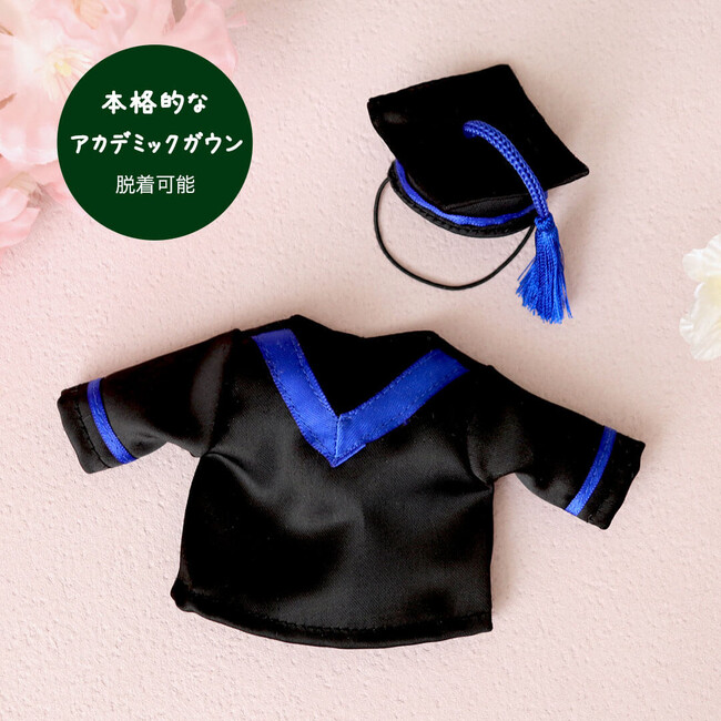 「2024卒業卒園記念ベア」は国際的な卒業のシンボルであるアカデミックガウンを身にまとい、卒園&卒業の特別な瞬間を演出する身長12cmミニテディベア。