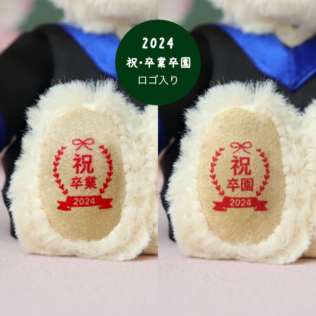 テディベアの足裏プリントは、「祝卒園」または「祝卒業」からご希望のプリントをお選びいただけます。卒業の年号入りの特別感たっぷりのデザインで、おめでとうの意味を込めた温かなメッセージが伝わります。