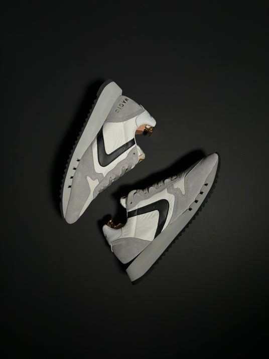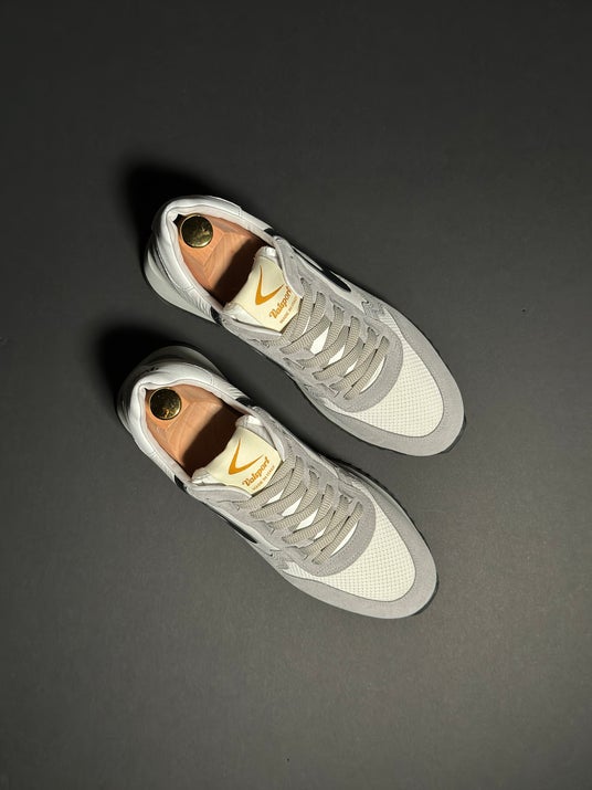 トリプルコラボモデルでは、アッパーにイタリア製のライトグレーのスウェードやホワイトのメッシュ素材を組み合わせました。