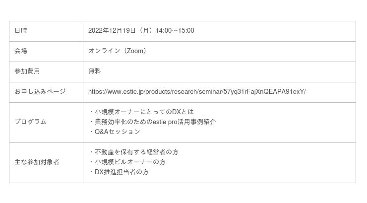 estieは、12月19日(月)、保有オフィスの空室の増加・長期化にお悩みの方や、少人数でも最大のパフォーマンスを上げたいとお考えの方を対象に、「保有棟数10棟以内のビルオーナー向け業務効率化セミナー」を開催します。今まで不動産業界では最大限活用されてこなかった「データ」と「ソフトウェア」を用いることで可能となる、大競争時代を生き残るための最適な戦略立案について、estieが提供する不動産データ分析基盤「estie pro」を活用しながらご紹介します。