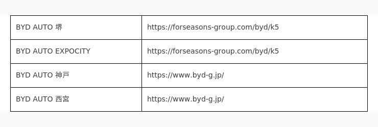BYD Auto Japanは「eモビリティをみんなのものに。」をブランドパーパスとして掲げ、全国にBYDのeモビリティに触れていただける場を拡充しております。近畿地方では、ショールームを備えた正規ディーラー店舗としてBYD AUTO 堺、BYD AUTO EXPOCITYなどをオープンしているほか、BYD AUTO 神戸、BYD AUTO 西宮をはじめとした開業準備室では、試乗や購入に関する相談および購入後のアフターサービスの受付を行っています。