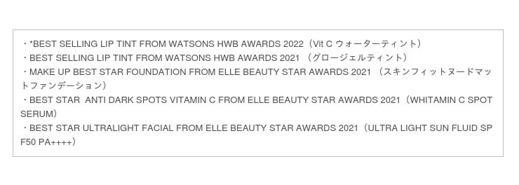 今回、ブライトウィン(Bright&Win)のウィンがプレゼンターに就任した「Vit C ウォーターティント」は、世界最大級ドラッグチェーン・WATSONS(ワトソンズ)の “HWB AWARDS”リップティントカテゴリーで、早くも2022年ベストセラーを受賞。その他にも、ファンデーションや美容液、日焼け止めなど、様々なカテゴリーで名誉あるアワードを数多く受賞しています。