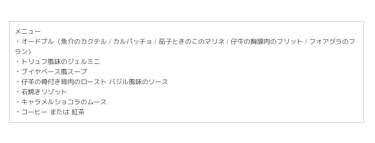 本コースのメインディッシュには、絶妙な火入れでしっとりと柔らかくジューシーに仕上げた『仔羊の骨付き背肉のロースト バジル風味のソース』をご用意。美味しさを引き立てるバジルのソースとともにお召し上がりください。女子会に欠かせないデザートでパティシエがご用意するのは『キャラメルショコラのムース』。濃厚なチョコレートにほろ苦いキャラメルのアクセントが加わった口どけ滑らかなオトナのスイーツです。