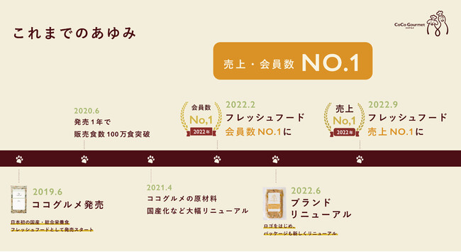 ワンちゃんと愛犬家のみなさまに愛されて、ココグルメは売上No.1(※1)、会員数No.1(※2)、ウェブアクセス数No.1(※3)など6冠を達成、継続率95%を維持しています。