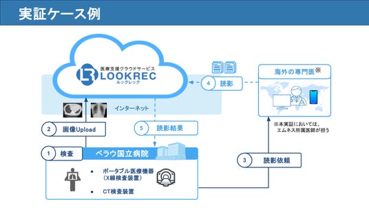 本実証実験では、ベラウ国立病院にて、難症例の検査等で海外専門医へ患者の検査画像を共有し、コンサルテーションを受けるといった臨床ニーズを想定。エムネスが提供する医療支援クラウドサービス「LOOKREC(※1)」を使用することで、海外の専門医との連携がリアルタイムで可能となり、より精度の高いコンサルテーションが受けられるようになります。本実証実験に協力いただいた現地医師からは、医療体制の強化に効果を実感いただけました。