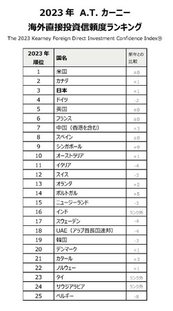 経営コンサルティング会社A.T. カーニー(東京都港区、日本代表:関灘 茂)は、2023年 海外直接投資信頼度指数(The 2023 Kearney Foreign Direct Investment Confidence Index(R)、以下FDICI) 調査結果を公開し、投資先として魅力のある国上位25カ国を発表しました。