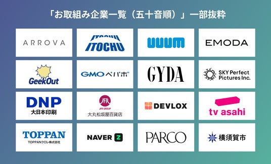(写真左から)株式会社ARROVA、伊藤忠商事株式会社、UUUM株式会社、EMODA、GeekOut株式会社、GMOペパボ株式会社、GYDA、株式会社スカパー・ピクチャーズ、大日本印刷株式会社、株式会社大丸松坂屋百貨店、株式会社DEVLOX、株式会社テレビ朝日、TOPPANクロレ株式会社、NAVER Z Corporation、株式会社パルコ、横須賀市