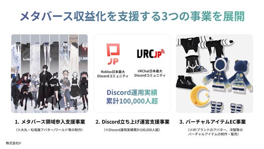 株式会社Vの3つの事業、1.メタバース領域参入支援事業、2.Discord立ち上げ運営支援事業、3.バーチャルアイテムEC事業