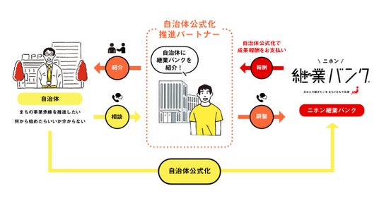 自治体公式化推進パートナー自治体への継業バンク導入を推進し、導入が決定した場合に成果報酬を得られる仕組みです。