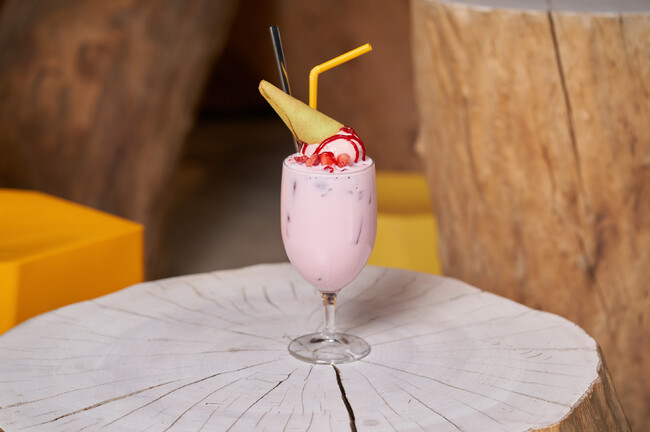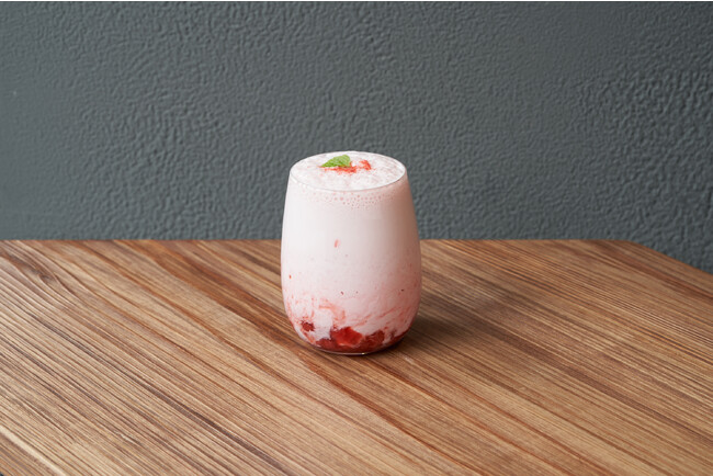 どこか懐かしさを感じるいちごミルクに、いちごアイス、苺の果肉、チュイルクッキーがのった見た目から楽しめる期間限定ドリンク。