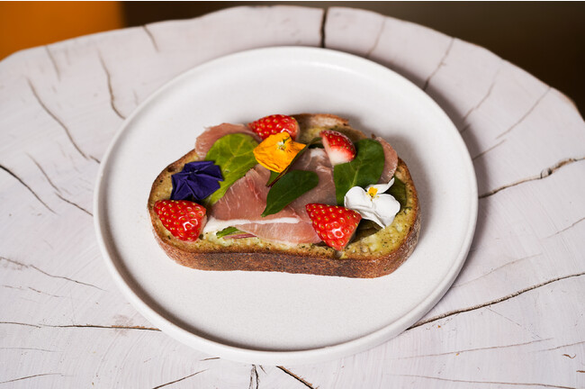 カンパーニュにバジルホワイトソースを塗り、いちご、生ハム、ベビーリーフ、エディブルフラワーをトッピングしました。