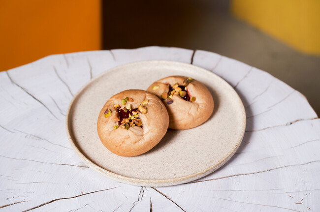 いちごパウダーを練り込んだ菓子生地に、あまおうクリームとあまおうジャムを包みピスタチオをトッピングしました。