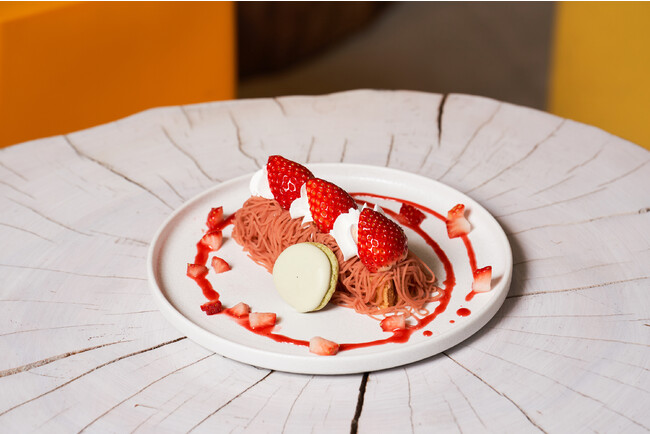 大人気の食パン「ムー」の生地をワッフル型で焼いた「ムッフル」に、自家製苺のモンブラン、自家製苺クリーム、苺アイス、苺ソース、ドライベリー、ストロベリーパウダー、あまおう苺をトッピング!あまおう苺をたっぷりと乗せ、苺の酸味と甘みが楽しめる自家製のクリームなどと飾られた贅沢なワンプレート!