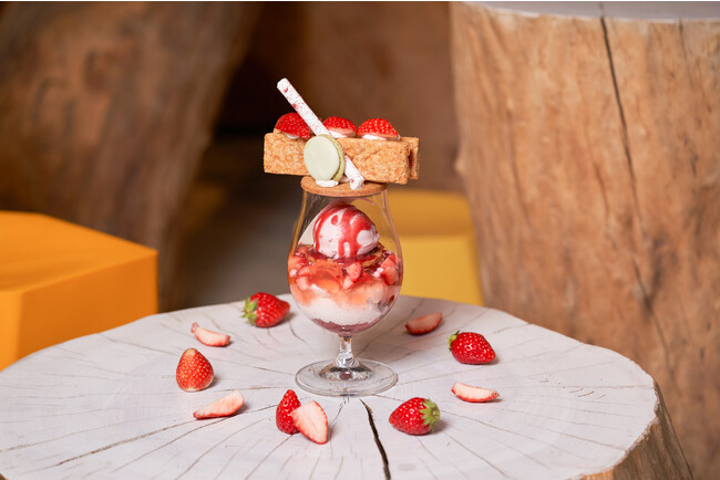 下から苺ソース、クラム、苺クリーム、苺、苺ゼリー、苺アーモンドチョコ、苺ミルクアイスを詰め込み、上にはサクサクサブレにカスタードミルフィーユと苺をのせ、上下で全く違う苺デザートをお楽しみいただけます。季節限定のいちごパフェを是非ご賞味ください!