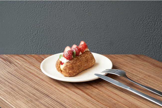 自家製のクッキーシューにカスタードクリームとホイップクリーム、カットした苺をたっぷり入れ、贅沢に苺をトッピングした見た目も可愛いシュークリームです。
