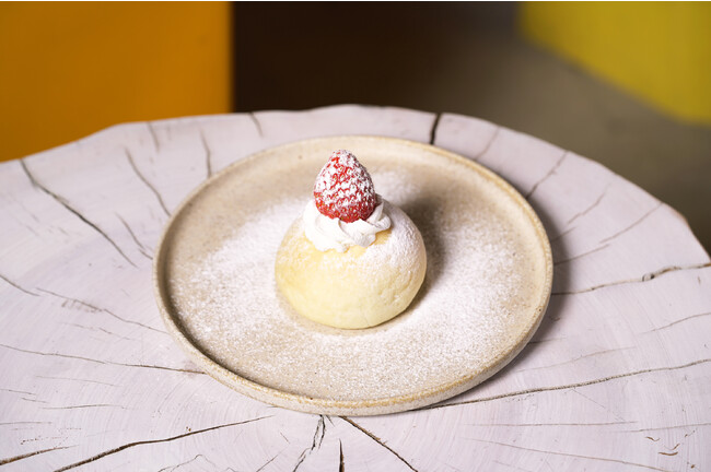 白くてもちもちの生地に餡子とホイップを入れ上にはいちごをトッピングし大福のような可愛らしい見た目に仕上げたパンです。