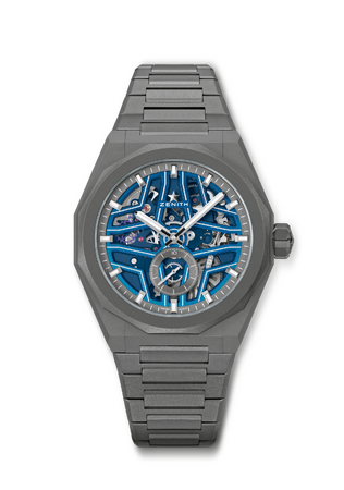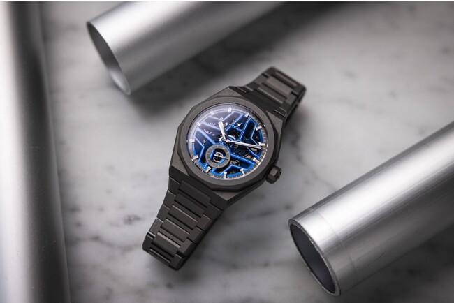 「デファイ スカイライン スケルトン」をベースとし、12角形のベゼルを備える角張った41mmケースの全体と、一体型ブレスレットの素材に初めてマイクロブラスト仕上げのチタンが使用されました。これにより、落ち着いたグレートーンの均一な質感が表現され、光の反射が可能な限り抑えられています。また、10気圧(100m)の防水機能を備えるねじ込み式リューズと、交換可能なストラップシステムを採用したことで、ウォータースポーツをより満喫できるウォッチへと仕上げられました。交換用に付属するブルーのラバーストラップは、工具を使うことなく付け替えが可能です。