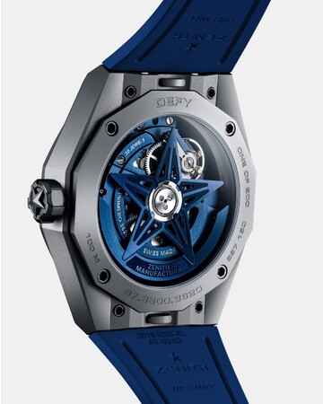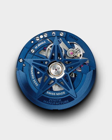 「デファイ スカイライン スケルトン ナイトサーファー エル・プリメロ」を特徴づけるこのパワフルな機能は、高振動自社製自動巻ムーブメント エル・プリメロ 3620によるもので、5Hz(毎時36,000振動)の脱進機が1/10秒表示を直接駆動します。ブルーの星をモチーフにした双方向ローターを備えた自動巻機構は、その性能を効率的に発揮し、約60時間のパワーリザーブを実現しています。