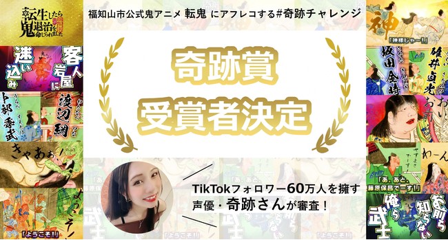 「奇跡賞」の選出は合計21件の参加動画の中から、TikTokフォロワー60万人を擁す声優・奇跡さんが行いました。奇跡さんは「皆さまがチャレンジしてくれたこと、私にとって素敵な《奇跡》になりました。本当にありがとうございます」とコメントを寄せています。「奇跡賞」の4名には、奇跡さんのサイン入り「転鬼」台本、福知山市の鬼グルメなどの鬼プレゼントをお渡しします。