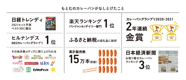 2020年に公式オンラインショップを開設し、多い日には1日に約6,000本を販売。各メディアにて入手が難しい「幻のカレーパン」としてご掲載をいただき、日本一のカレーパンを決める「カレーパングランプリ2021」では沖縄県勢初となる、2年連続金賞を獲得。さらに2021年12月に「日本経済新聞」の土曜版「NIKKEIプラス 1」のお取り寄せカレーパンランキングで「もとむのカレーパン」が3位を獲得しました。
