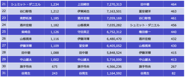 1位と選出された選手の最下位で、記事数差は2倍超に