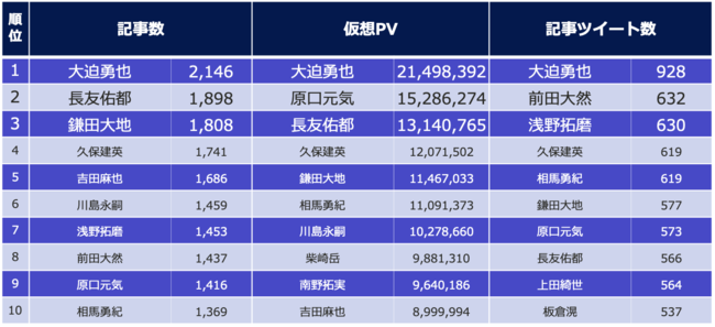 選出された選手の中で最も各数値が小さかった中山雄太選手と比べると、記事数が約2.1倍、仮想PVが約3.8倍、記事ツイート数が約2.3倍です。