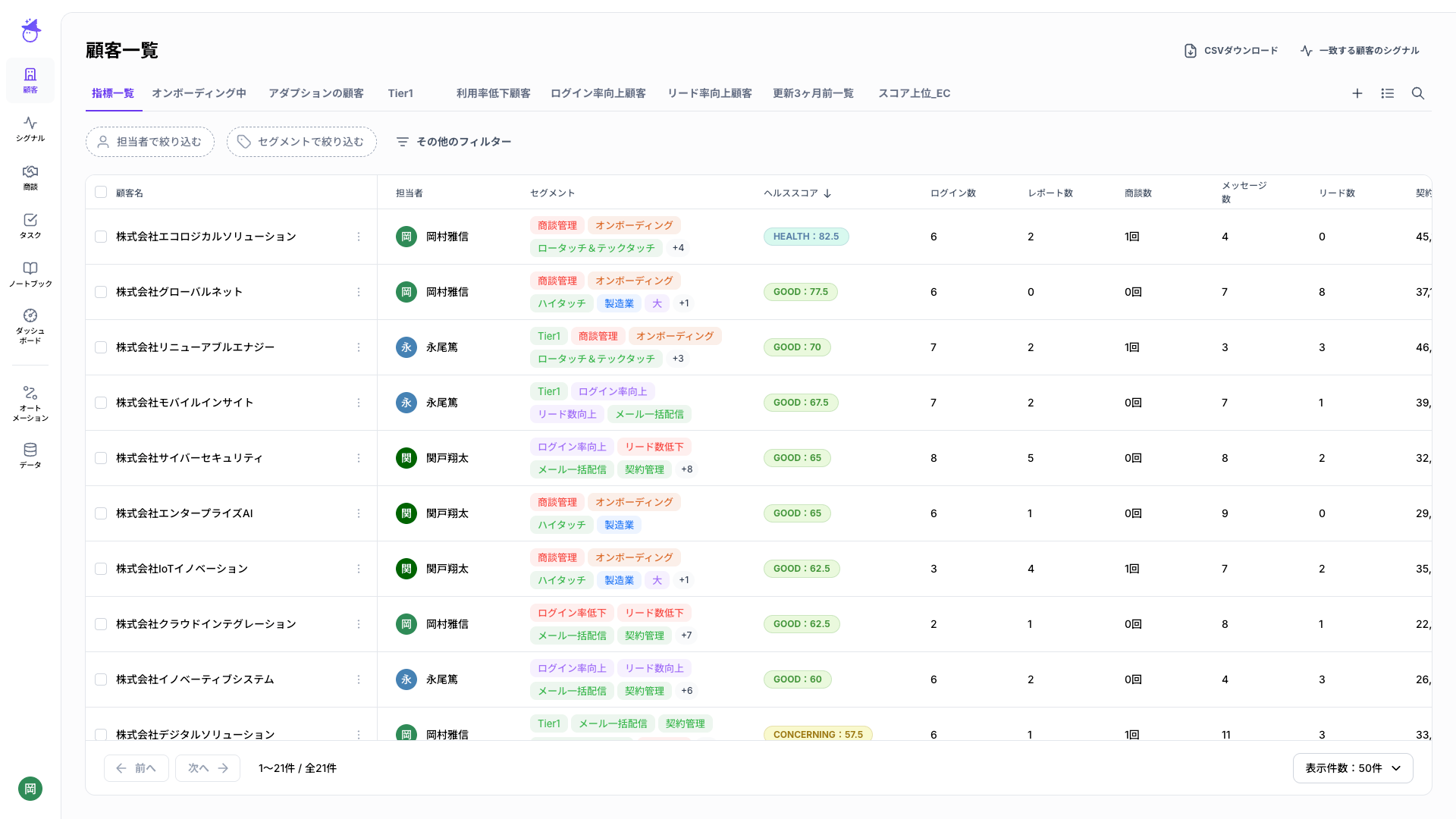 松木さん:導入当時はお客さんの数が急激に増え、優先的にアクションすべき顧客の特定が課題でした。そこでMagicSuccessのデータを活用してヘルススコアを作成し、優先度の高い顧客を可視化できるようになりました。