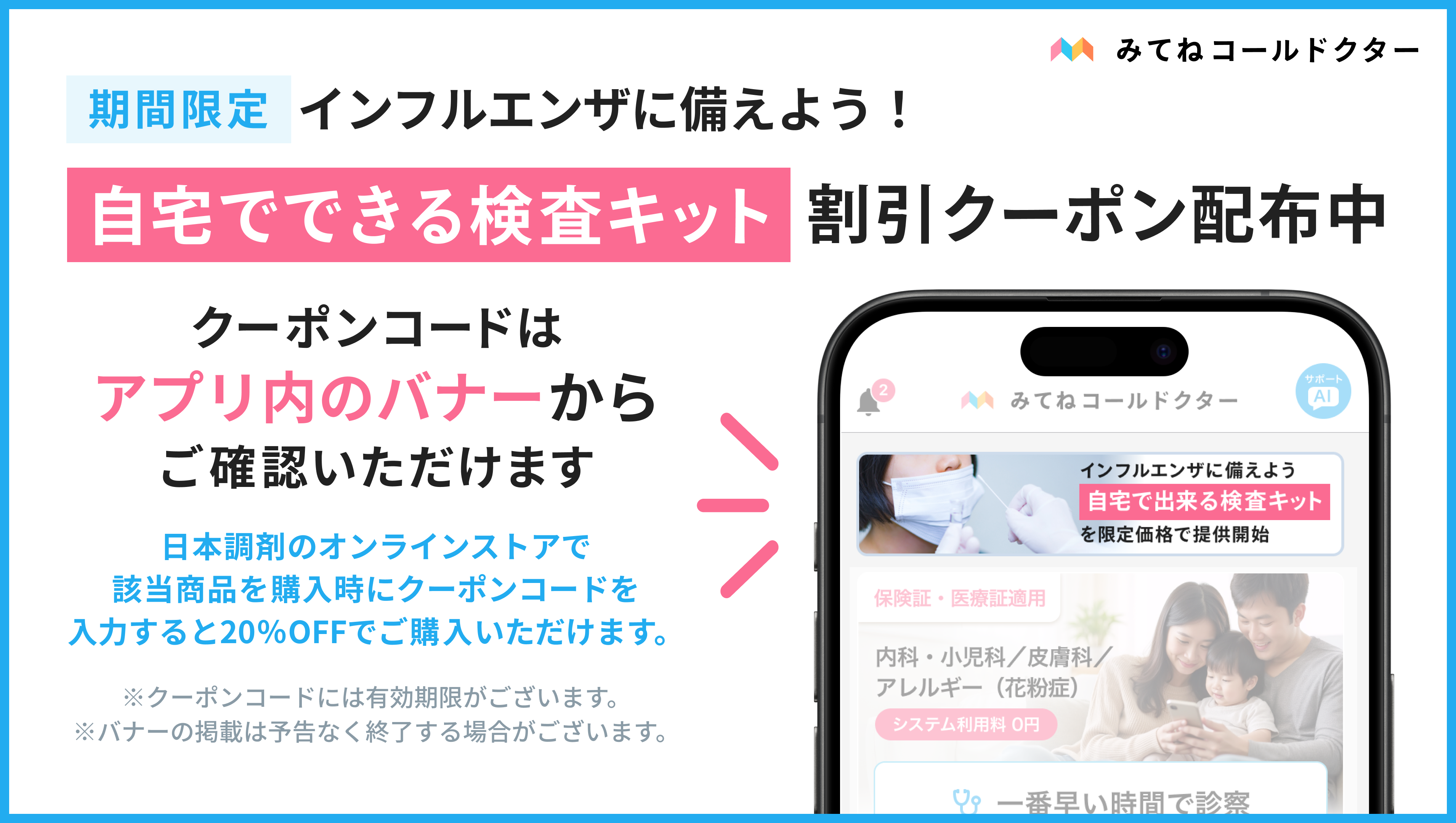 医師監修オンライン診療アプリ「みてねコールドクター」が日本調剤と連携し、インフルエンザ・コロナ同時検査キットを限定価格で提供開始【クーポン配布】