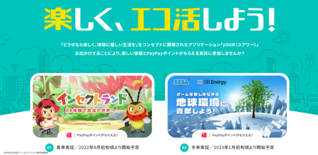 夏季実証では、アプリを通じて、指定された時間に特定のスポットでチェックインすることで、 PayPay ポイントが獲得できるほか、香川照之プロデュース自然教育アニメ「インセクトランド」のキャラクターが登場するARコンテンツの体験ができます。
