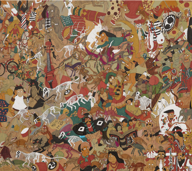 ハサミで紙を櫛状に細かく切ってゆくことでふわふわとした繊細な立体物を生み出す藤岡祐機。独自のカリグラフィと、架空の映画の絵コンテのようなコマ割りの絵を描き出す上土橋勇樹。ユーモラスな表情を浮かべる不思議な粘土の生き物のようなオブジェをつくる澤田真一。古久保憲満はテレビのニュースやインターネットで情報を集め、大きな画用紙にどこにもない空想の都市を緻密に描き出します。大型の作品としては、鵜飼結一朗の作品があります。恐竜の骨や骸骨、動物たちや様々なキャラクターがみっしりと描かれた画面は、妖怪たちが列をなして練り歩く百鬼夜行の現代版のよう。幅82.5cmの画用紙に描かれた作品は、右から左に向けてつながるように描かれていて、今回は14 メートルに及ぶ長大な絵巻として展示します。