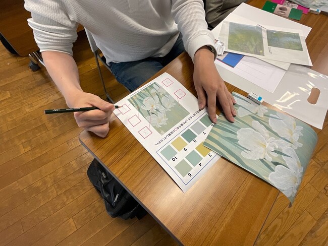 当社ではこの事業に協力し、2021年に制作した横山大観「阿やめ」とモネ「睡蓮」の原寸レプリカを活用したワークショップ「大観の色、モネの色―東西絵画の色を知る」を企画・実施しました。本ワークショップは、2022年11月18日に上野区民館で実施され、この内容を幅広い方々に体験していただくことを目的にWebでも公開しています。ワークショップは約30分で、前半は日本画の専門家による講義、後半は大観とモネの作品に関わる4つの課題で構成されています。長年にわたり国内外の優れた絵画作品の複製画制作に携わってきた当社だからこそ提供できるレプリカ制作の知見や技術を取り入れ、レプリカ制作過程の追体験を通して、横山大観とモネの制作手法の違いや共通点、時代を通して東西で相互に影響しあった歴史などを学ぶことができます。