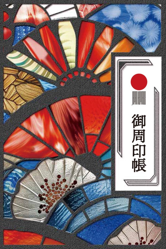 御朱印帳を模した蛇腹折の帳面です。表紙はステンドグラス風の「扇」と「花」の2パターン
