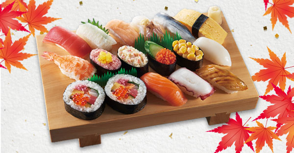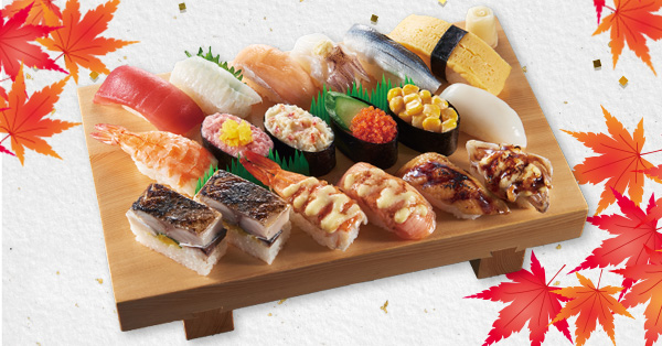 海鮮巻や人気の「まぐろ」や「サーモン」など定番握りを盛り込んだ、たっぷり17貫!食欲の秋にふさわしいメニューです。